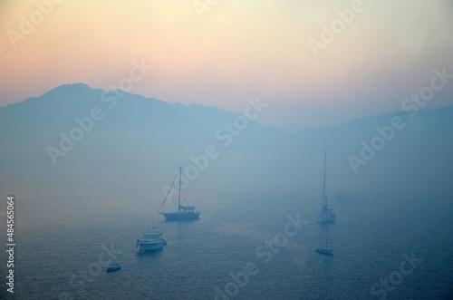 Smog in Marmaris Bay at morning after forest wildfire. Marmaris, Turkey. Summer 2021
