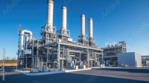 Smoke stacks of a power facility release clean vapor into a clear sky. The image showcases technological progress and environmental efforts.