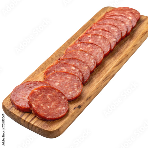 Smoked red Sausage sliced and arranged on the wooden board, cutout PNG transparent background