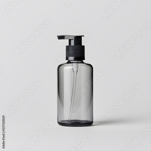 Smoked-glass pump bottle, minimalist studio shot, product display, packaging design