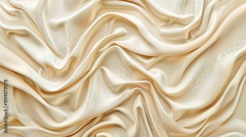 Smooth beige satin fabric with soft folds and wrinkles, creating a shiny and luxurious texture, suitable for textiles and fashion concepts.