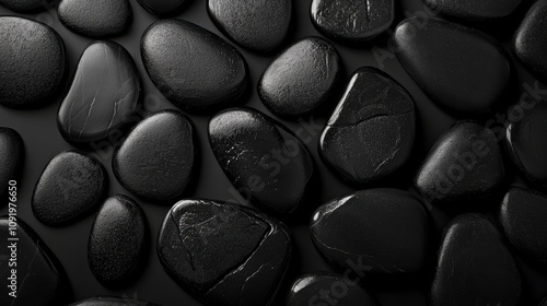 Smooth Black Stones on a Dark Surface Creating a Calming and Elegant Background Ideal for Modern Design, Spa, Wellness, and Natural Aesthetic Projects