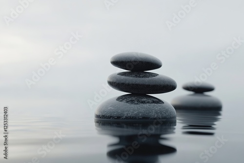 Smooth black stones rest gently on a still, reflective water surface, creating a serene atmosphere perfect for meditation and focus. The misty backdrop enhances the tranquil mood
