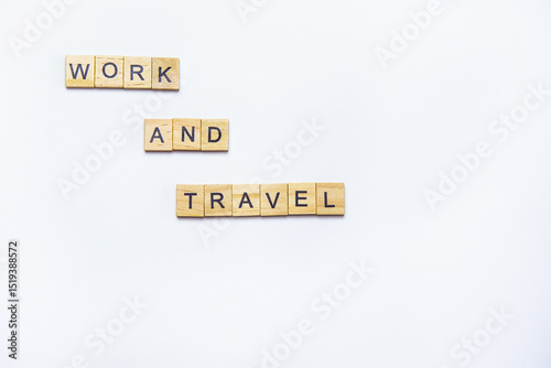 Smoothly laid out text with wooden cubes with the inscription work and travel, the concept of robots and travel abroad.