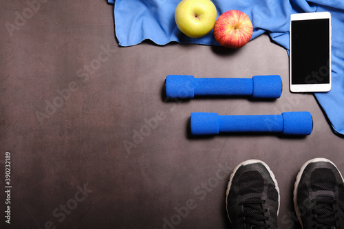health, physical exercise, dumbbell, fitness, apple, activity, towel, sneaker, dark, lifestyle, copy space, fit, well-being, weight, measurement, measure, loss, creation, topview, slim, training, active, copy, dieting, exercise, care, belt, sport, indoor, gym, flask, healthy, grey background, colourful, concept, dark background, studio, equipment, blue, phone, slipper