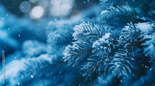 Snow covered christmas tree branches. Generative AI.