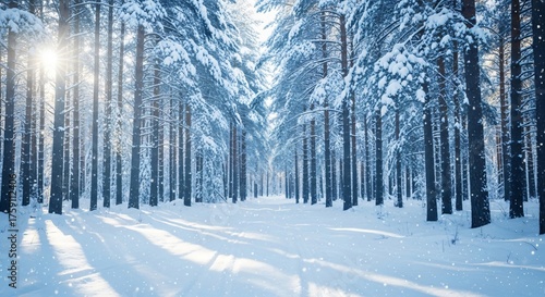 Snow covered pine forest path bathed in bright sunlight with falling snowflakes