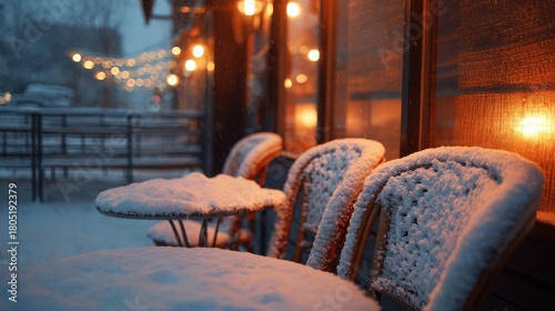 snow, table, chair, patio, winter, season, cold, weather, light, blur, night, cafes, eatery, scene, nobody, empty, frost, glacé, decoration, festive, celebration, holiday, christmas, new, year, evening, atmosphere, romantic, cosy, warm, glow, illuminated, exterior, furniture