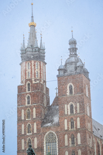 Snow over Saint Mary’s Basilica in Krakow, Poland