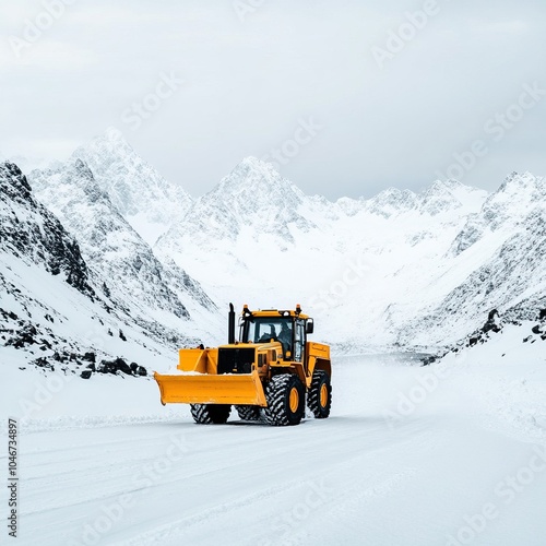 Snow plow clearing a mountain road, surrounded by majestic snow-covered peaks, dramatic winter landscape.