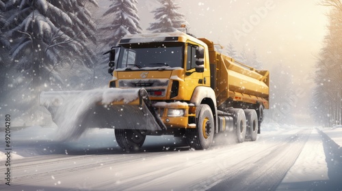 Snow plow truck in action, on winter snowy road.