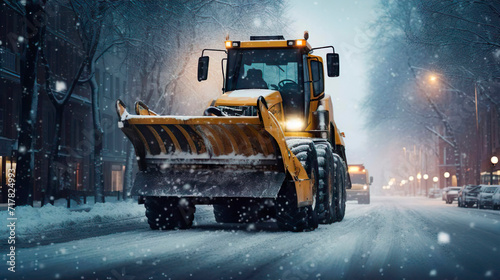 Snow removal orange equipment in the city street. Snow truck tractor cleaning snowy road in snowstorm. Cleaning and clearing roads in the city from snow in winter. Snow removal after snowfalls and