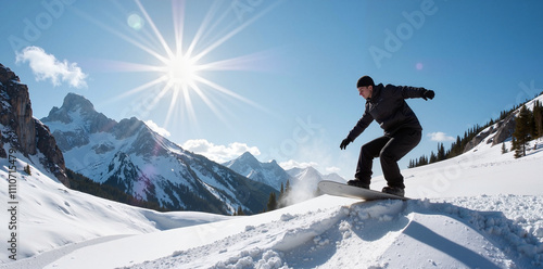 snowboarder, snowboarding, mountain, sport, sunshine, winter, action, athletic, trick, adventure, landscape, snow, high altitude, blue skies, extreme sport, male, cold weather, recreation, leisure, excitement, breathtaking, thrill, nature, adrenalin, slope, fitness, hiking, movement, training, powerful, sunny, exploration, energetic, snow-covered, powder, fresh air, fun, vibrant