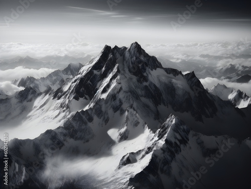 Snow-Capped Mountain Peak: Majestic, Tranquil, and Imposing Landscape Photography in Early Morning Aerial Drone Shot