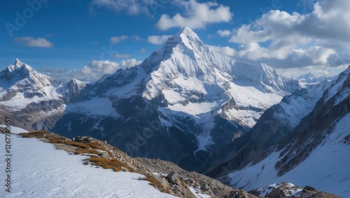 mountain, snow, peak, blue, sky, cloud, rocky, terrain, nature, landscape, outdoors, scenery, wilderness, travel, adventure, pristine, scenic, alpine, summit, daylight, cold, winter, environment, beauty, tranquil, picturesque, remote, elevated, fresh, explore, hike, natural, clear, bright, horizon, chilly, majestic, elevation, wild, calm, freedom, untouched, rural, skyward, atmosphere, serenity, panoramic, seasonal