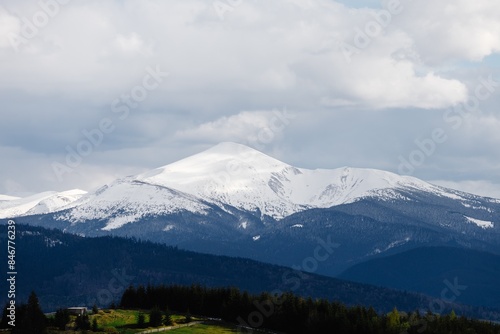mountain chain, snow-capped, mountain, cloud, sky, peak, snow, foliage, green, field, panoramic view, landscape, nature, scenery, travel, hiking, adventure, environment, wilderness, exploration, scenic, majestic, beauty, wonder, breathtaking, calmness, serenity, peace, photo