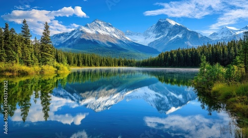 Snow-capped peaks reflected in the calm, clear waters of a mountain lake, creating a beautiful mirror effect of nature's elegance