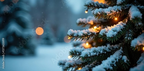 Snow-covered evergreen tree with twinkling lights, festive atmosphere, delicate