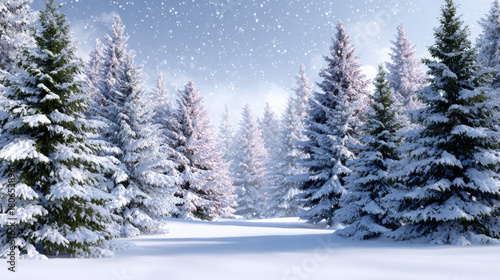 Snow-covered evergreen trees in a serene winter landscape, with gentle snowfall creating a tranquil atmosphere, inviting exploration and appreciation of nature's beauty