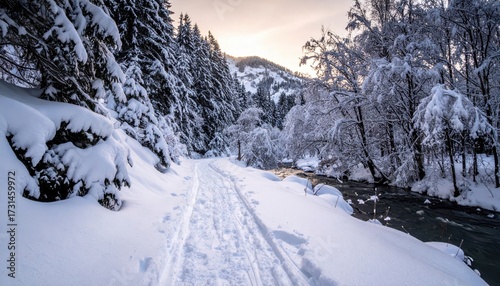 snow, winter, forest, trail, path, river, tree, cold, landscape, nature, outdoors, season, white, frost, ice, fresh, scenic, tranquil, peaceful, sunlight, dawn, day, beautiful, covered, sky, pristine, wood, glacé, water, journey, travel, exploration, adventure, wilderness, environment, calm, serene, light, picturesque, wonderland, untouched, quiet, clear, bright, chilly, majestic, aethereal