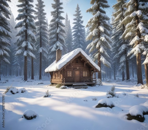 Snow-covered forest with a small cabin and a heart-shaped roof, snowy, quiet, mountains