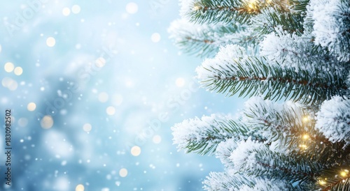 Snow-covered Pine Branches Glisten in a Winter Wonderland With Soft Falling Snowflakes