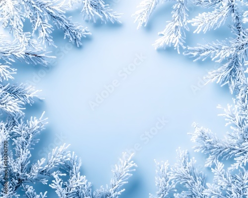 pine, branch, snow, winter, background, blue, light blue, frame, border, frost, christmas, holiday, decoration, design, symmetric, pattern, texture, nature, cold, white, sprig, twig, conifer, evergreen, needle, icy, frosted, glacé, seasonal, christmas background, decorative, arrangement, composition, graphic, image, photo, still life, empty space, blank space, template