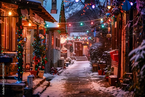 winter, snow, street, colourful, light, holiday, decoration, evening, cosy, festive, neighbourhood, wonderland, celebration, small, town, charme, activity, calmness, view, season, community, warmth, atmosphere, scenery, illumination, seasonal, nature, serenity, snowflake, joy, togetherness, pedestrian, family, tradition, lantern, house, display, stroll, magical, quaint, charming, inviting, spirit, peaceful