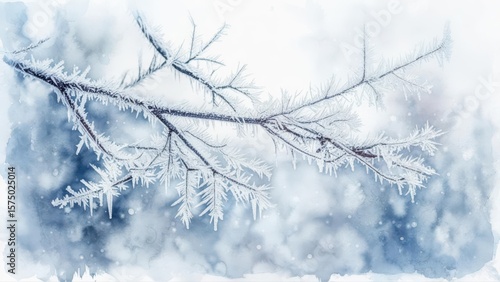 watercolor, tree branch, snow-covered, hoar frost, frost, blurred background, winter, bokeh, crisp, cold, ice, serene, peaceful, tranquil, nature, outdoors, detail, delicate, white, blue, light, seasonal, illustration, art, painting, drawing, atmospheric, natural