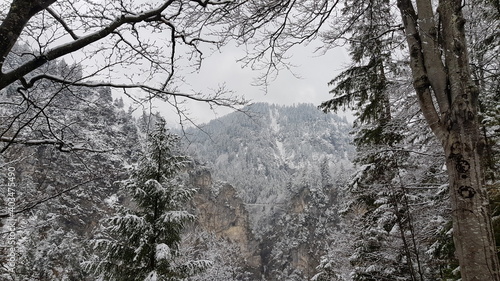 Snow-covered trees and white mountains at Schloss Neuschwanstein Germany and behind the picture is the Queen Mary Bridge.