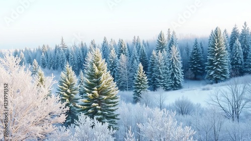 Snow-covered trees in a frozen winter forest landscape, winter, seasonal, outdoors