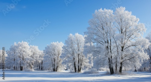 Snow-covered trees stand in a winter landscape under a clear blue sky. The scene is serene and captures the beauty of a snowy day.