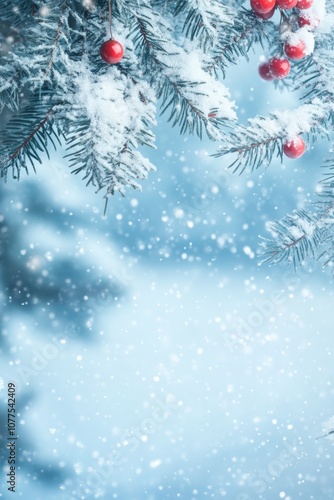 Snow-dusted pine branches adorned with red berries, capturing a serene winter scene in the foreground.