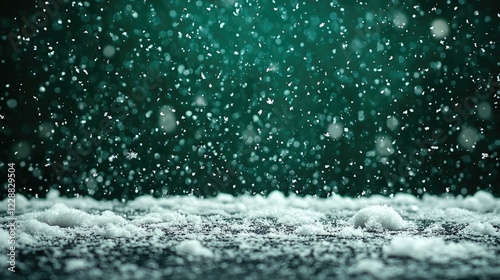 Snowfall gently covers a dark surface, creating a serene winter atmosphere with blurred background