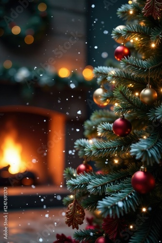 Snowflakes gently fall on a decorated Christmas tree near the fireplace, snowflake, flakes