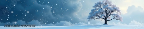 Snowflakes gently fall on the isolated tree, casting a peaceful atmosphere, winter, solitude
