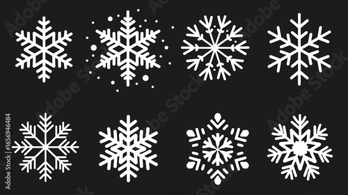 Snowflakes icons, White Snowflake, Snowflakes template, Snow winter, Snowflakes icons, black background, Generative AI illustrations.