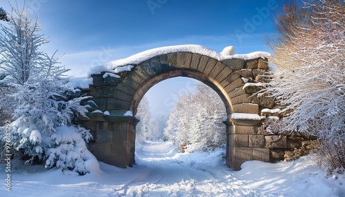 Snow-laden ancient stone archway
