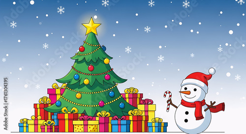 christmas, snowman, winter, snow, tree, holiday, christmas, decoration, illustration, vector, christmas tree, celebration, snowflake, card, hat, star, cold, cartoon, year, season, new, gift, design, santa, december