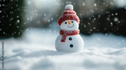 Snowman in a winter setting with snowflakes falling, copy space for text, vibrant colors, festive mood