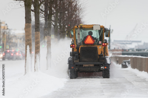 Snowplow truck vehicle removing snow after blizzard/snowstorm in motion. Urgent city street cleaning at daylight. Heavy snowfall at St. Petersburg Russia. Winter time
