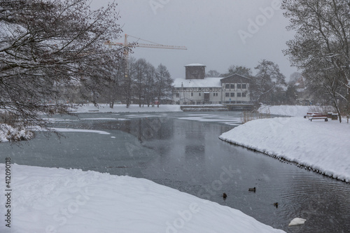 Snowstorm at the mill pond in Oliwa. Gdańsk, Oliwa, Poland.