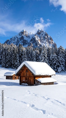 snow, chalet, mountain, winter, alpine, wooden, house, landscape, nature, cold, peaceful, picturesque, tranquil, idylli, serene, frosty, forest, tree, clear, blue, sky, sun, cabin, hut, scenic, view, beauty, snow-covered, travel, vacation