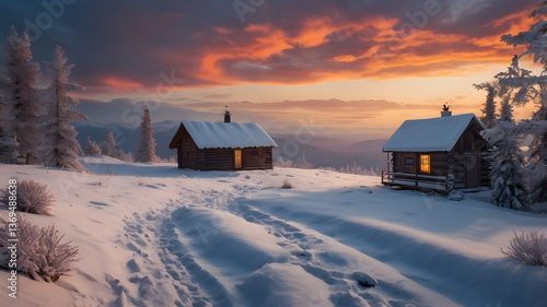 Snowy Cabins at Sunset in Winter Landscape