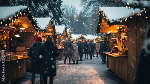 christmas, market, snow, booth, people, winter, light, holiday, festive, decoration, gift, shopping, tradition, celebration, joy, gathering, atmosphere, magical, illuminated, seasonal, european, german, austrian, swiss, nordic, cosy, rustic, wooden, street, fair, night, evening, snowy, gloomy, glove, hat, coat