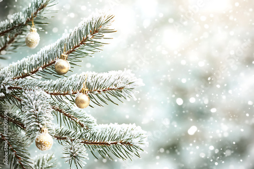 Snowy Christmas tree with decorations, winter wonderland scene.