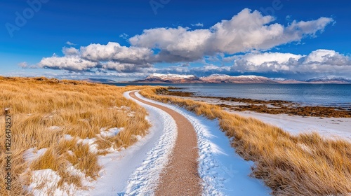 path, snow, coastal, winter, landscape, scotland, scenic, road, beach, sky, cloud, mountain, nature, travel, photo, ocean, sea, dune, grass, horizon, cold, white, blue, journey, adventure, exploration, view, beautiful, picturesque, tranquil, serene, calm, peace, relaxation, get-away, escape, freedom, wild, untouched, remote, solitude