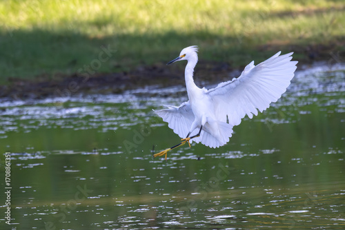 snowy egret, egret, landing, water, duck pond, lake, water bird, feather, wing, plumage, bird, avian, ornithology, birding