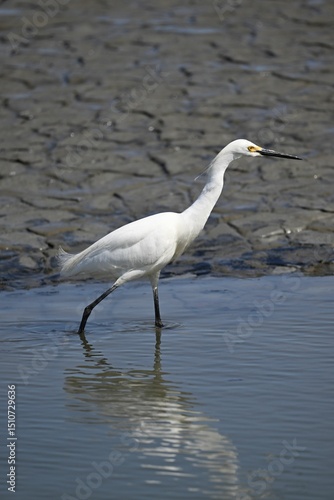snowy egret, bird, wading, water, mud, nature, wildlife, elegant, habitat, wetland, avian, graceful, environment, outdoors, animal, natural, serene, peaceful, ornithology, shore bird, marsh, birding, ecology, conservation, aquatic, feather