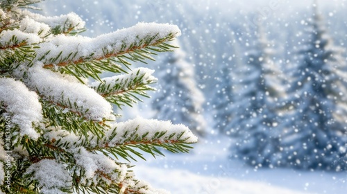 Snowy Evergreen Branches in Winter Wonderland Scene